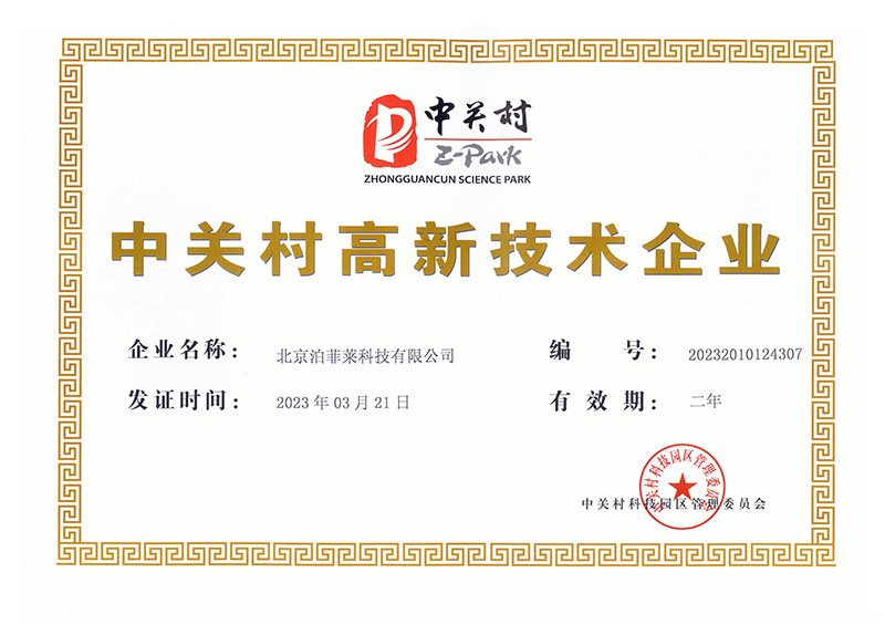 “中关村高新技术企业”是指在中关村科技园区国家重点支持的高新技术领域,持续进行研究开发与技术成果转化,并以此为基础开展经营活动,将重大高新技术成果转化成生产力,属于国内或国际先进的企业。此次成功通过认定,标志着泊菲莱科技自主研发水平、技术创新实力和成果转化能力获得了业界高度肯定和认可。同时,也为企业高质量发展、做强做优奠定了坚实基础。